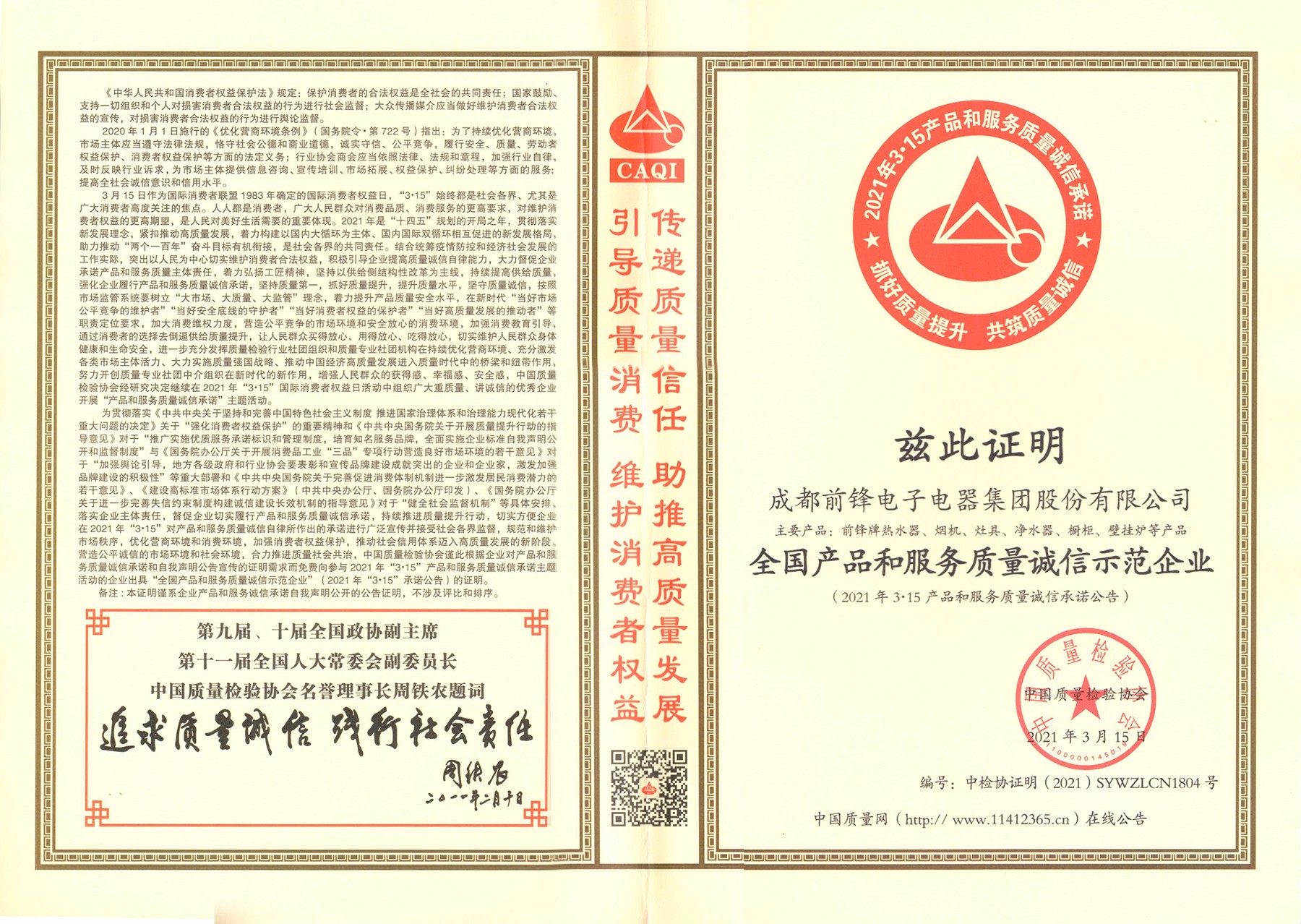 前鋒廚電榮獲“全國產品和服務質量誠信示范企業”稱號