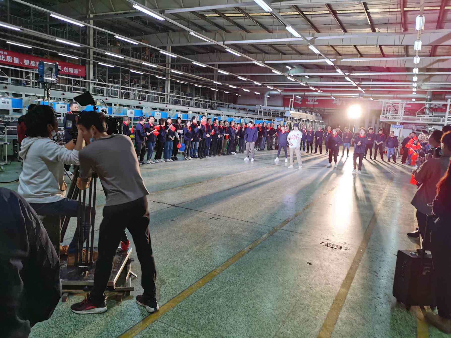 9000平方米的熱水器專配車間,這里被打造成了一個(gè)臨時(shí)的攝影棚——中間留出的一塊空地就是表演舞臺(tái),說唱歌手、舞蹈演員,輪番上場(chǎng)錄制。