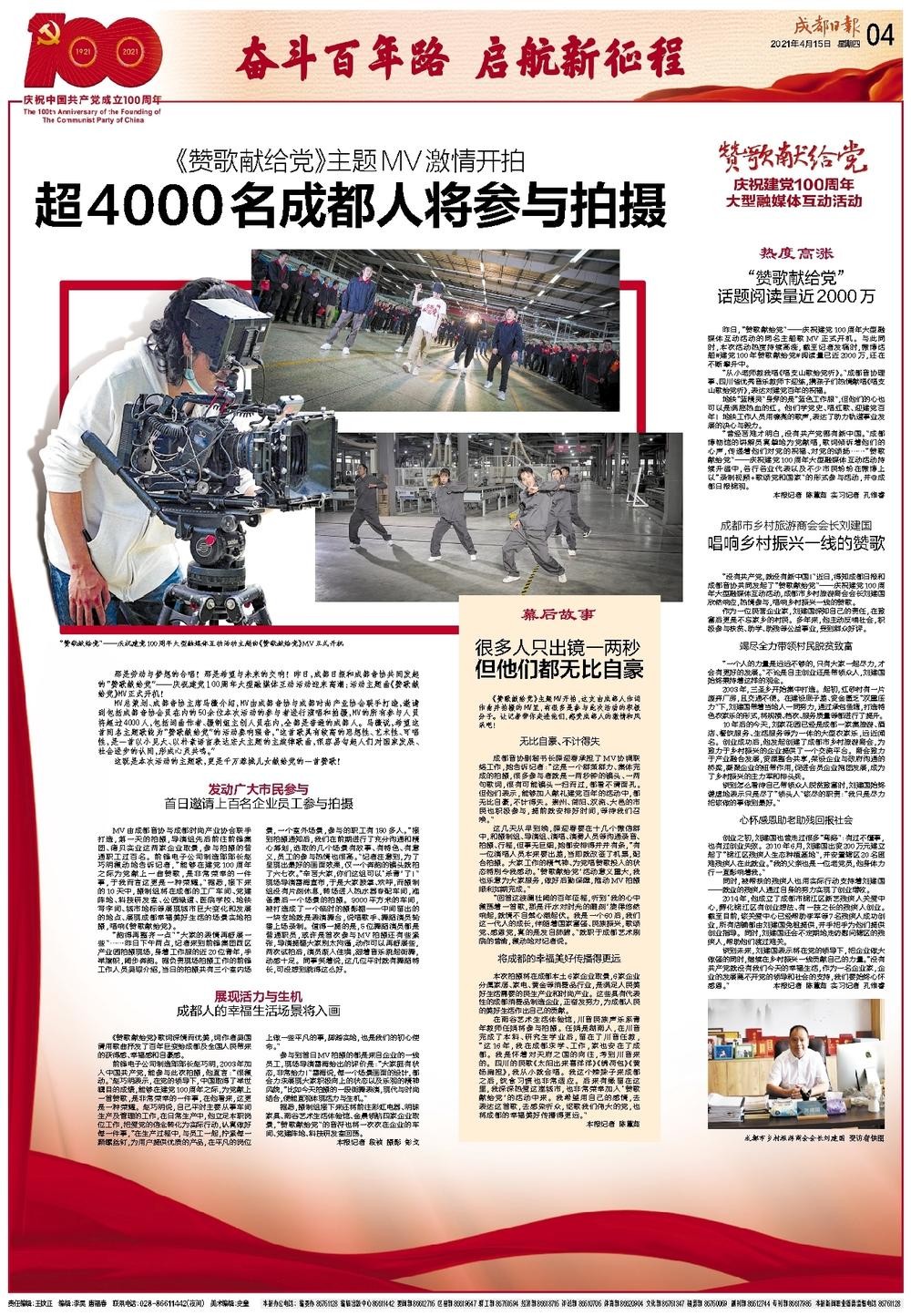 那是勞動(dòng)與夢(mèng)想的合唱!那是希望與未來的交響!在春回大地的時(shí)節(jié),成都日?qǐng)?bào)和成都市音協(xié)共同發(fā)起的“贊歌獻(xiàn)給黨”——慶祝建黨100周年大型融媒體互動(dòng)活動(dòng)也迎來高潮:活動(dòng)主題曲《贊歌獻(xiàn)給黨》MV在前鋒集團(tuán)西區(qū)產(chǎn)業(yè)園開機(jī)!充滿朝氣、朗朗上口的旋律,將從這一刻開始在城市的上空回蕩。