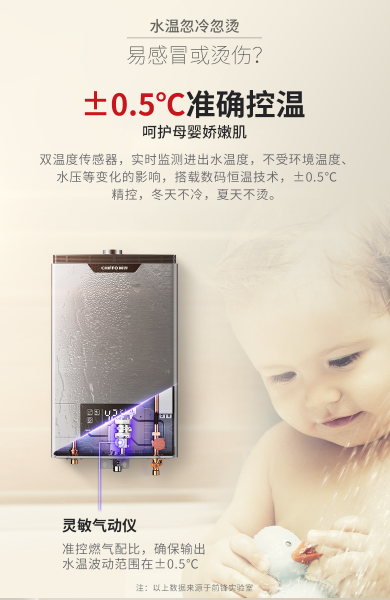 針對洗浴出水忽冷忽熱的痛點,前鋒F703熱水器獨具匠心的雙溫傳感器,實時監測進出水溫度,搭載數碼恒溫技術,冬夏自動適溫,真正實現“冬天不冷、夏天不燙”的現代沐浴新要求。同時依據設定溫度,出水溫差控制在±0.5℃范圍內,讓用戶徹底告別忽冷忽熱,真正享受到嬰兒般的恒溫舒適沐浴體驗。